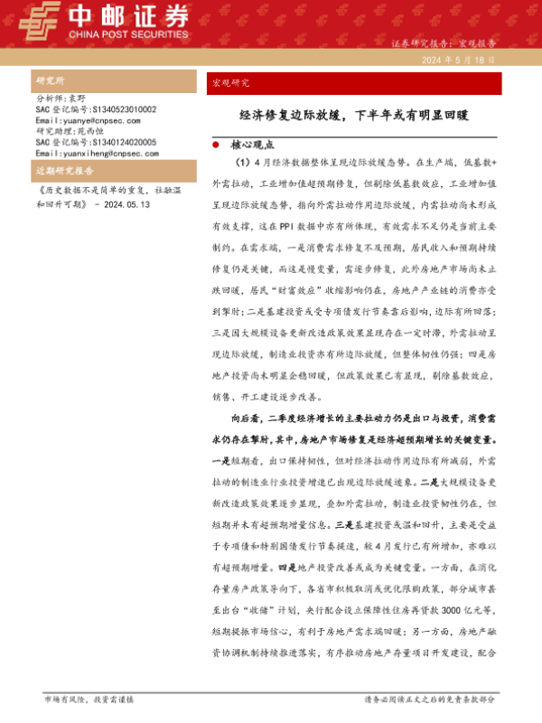 【中邮证券】【20240518】宏观研究:经济修复边际放缓,下半年或有明显回暖-44页 行业研究