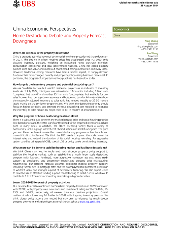 【UBS Securities Asia Limited】【20240828】中国房地产市场展望:去库存辩论与预测降级-16页 行业研究