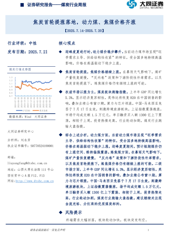 【大同证券】【20250721】煤炭行业周报:焦炭首轮提涨落地,动力煤、焦煤价格齐涨-14页 证券期货研究报告