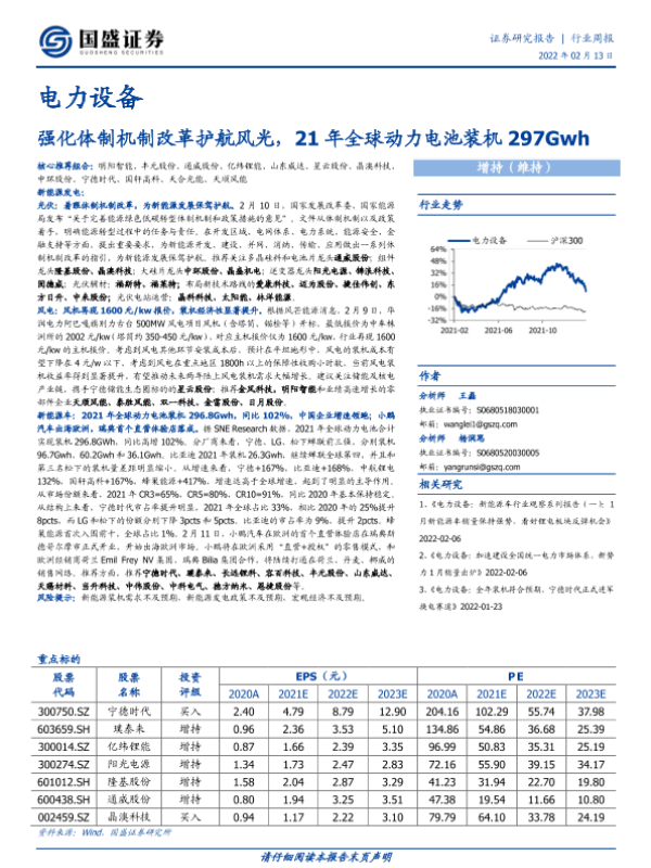 【国盛证券】【20220213】电力设备行业周报:强化体制机制改革护航风光,21年全球动力电池装机297Gwh-14页 行业研究