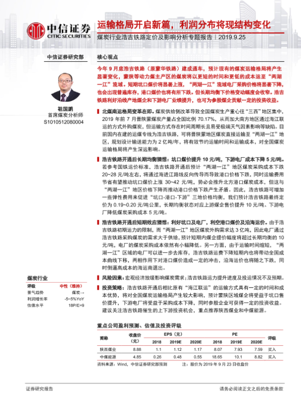 【中信证券】【20190925】煤炭行业浩吉铁路定价及影响分析专题报告:运输格局开启新篇,利润分布将现结构变化-17页 行业研究
