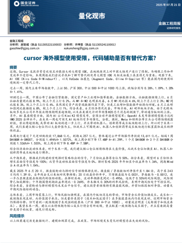 【国金证券】【20250721】量化观市:cursor海外模型使用受限,代码辅助是否有替代方案?-13页 宏观策略