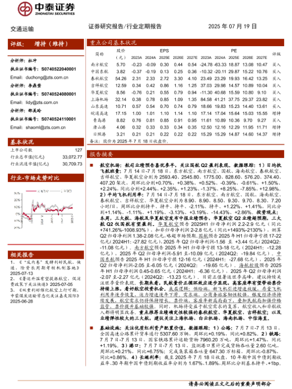 【中泰证券】【20250719】交通运输行业:华夏航空Q2盈利超预期,快递“反内卷”经营改善可期-24页 证券期货研究报告