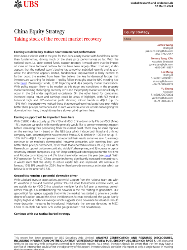 【UBS Securities Asia Limited】【20240312】China Equity Strategy - Taking stock of the recent market recovery-11页 行业研究