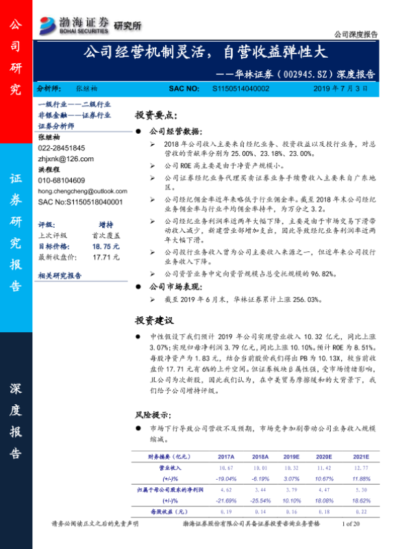 【渤海证券】【20190703】20190703-渤海证券-华林证券-002945.SZ-深度报告:公司经营机制灵活,自营收益弹性大-20页 行业研究