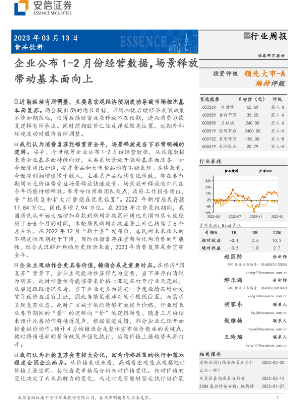 【安信证券】【20230313】食品饮料行业周报:企业公布1-2月份经营数据,场景释放带动基本面向上-20页 行业研究