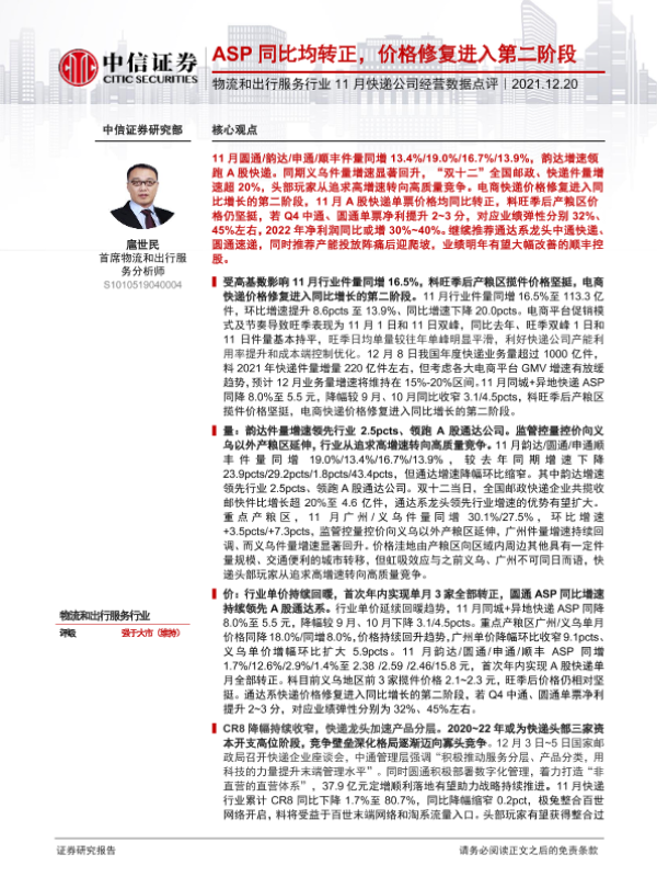 【中信证券】【20211220】11月快递公司经营数据点评:ASP同比均转正,价格修复进入第二阶段-3页 证券期货研究报告
