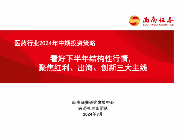【西南证券】【20240724】医药行业2024年中期投资策略:看好下半年结构性行情,聚焦红利、出海、创新三大主线-231页 行业研究
