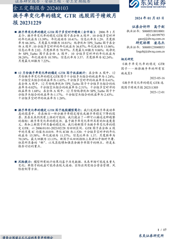 【东吴证券】【20240103】金工定期报告:换手率变化率的稳定GTR选股因子绩效月报-17页 行业研究