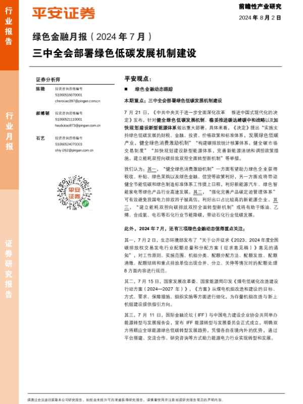 【平安证券】【20240802】绿色金融行业月报(2024年7月):三中全会部署绿色低碳发展机制建设-14页 行业研究