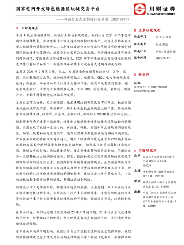 【川财证券】【20210917】科技行业先进制造行业周报:国家电网开发绿色能源区块链交易平台-11页 行业研究