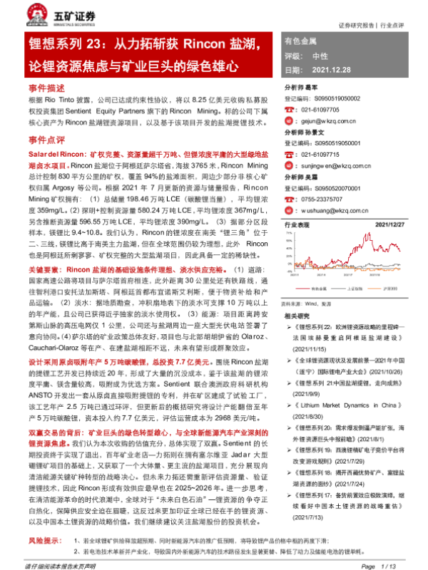 【五矿证券】【20211228】锂想系列23:从力拓斩获Rincon盐湖,论锂资源焦虑与矿业巨头的绿色雄心-13页 行业研究