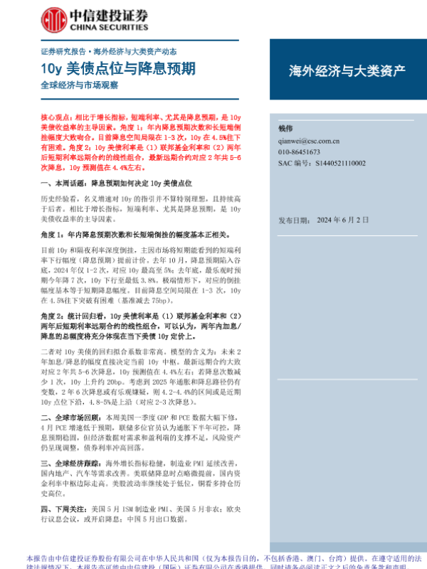 【中信建投证券】【20240602】全球经济与市场观察:10y美债点位与降息预期-12页 行业研究