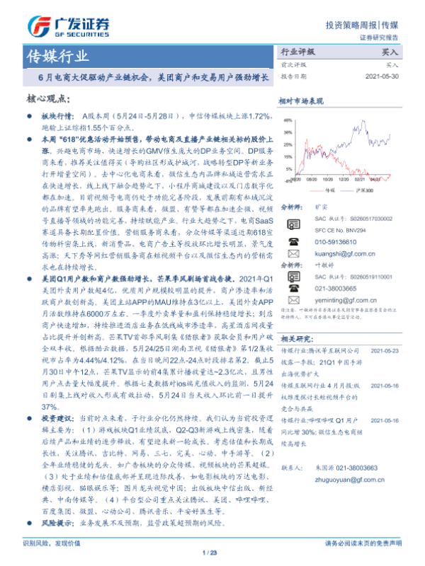 【广发证券】【20210530】6月电商大促驱动产业链机会,美团商户和交易用户强劲增长-23页 行业研究