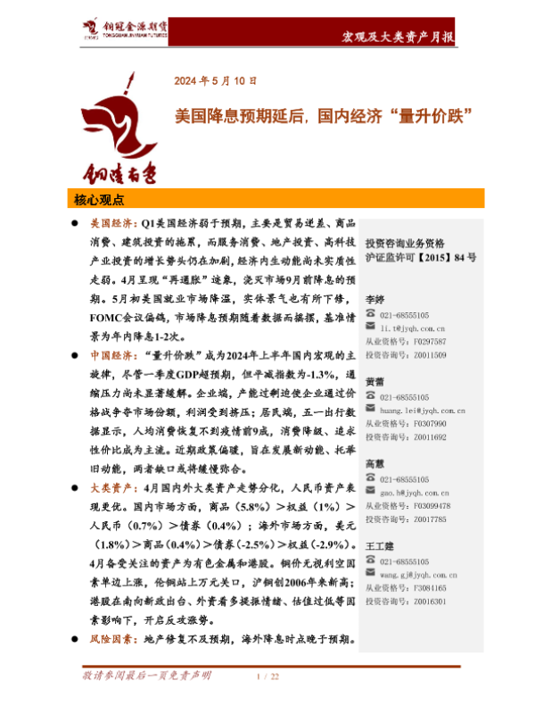【铜冠金源期货】【20240510】宏观及大类资产月报:美国降息预期延后,国内经济“量升价跌”-22页 行业研究