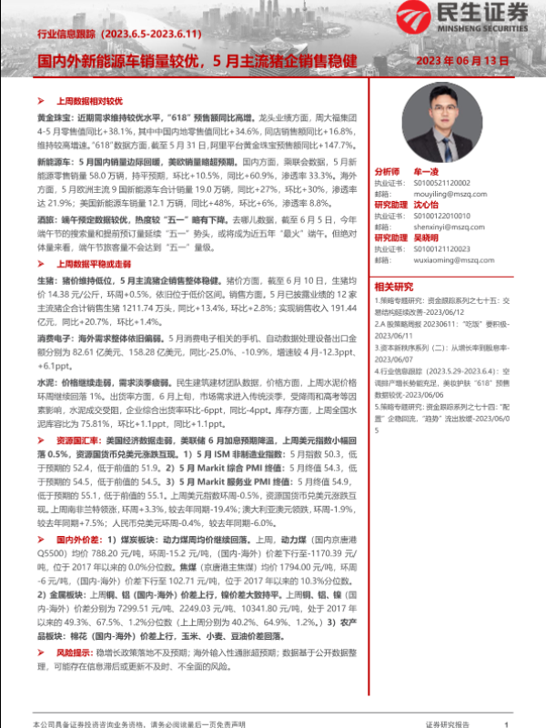【民生证券】【20230613】行业信息跟踪:国内外新能源车销量较优,5月主流猪企销售稳健-30页 行业研究