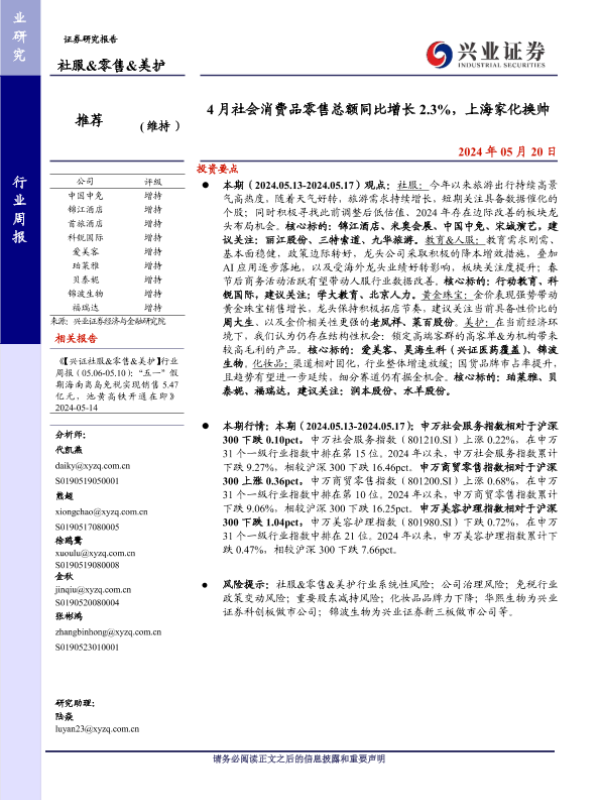 【兴业证券】【20240520】4月社会消费品零售总额同比增长2.3%,上海家化换帅-14页 行业研究