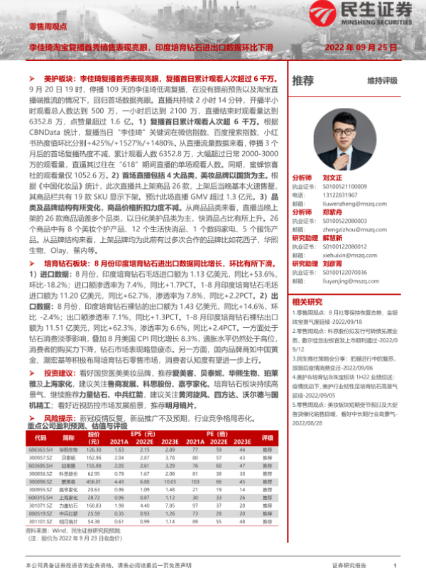 【民生证券】【20220925】零售周观点:李佳琦淘宝复播首秀销售表现亮眼,印度培育钻石进出口数据环比下滑-17页 行业研究
