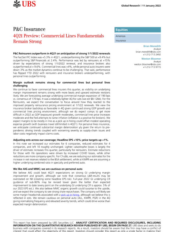 【瑞银】【20220111】瑞银-美股保险行业-2021年第四季度预览:商业线路基本面依然强劲-35页 行业研究