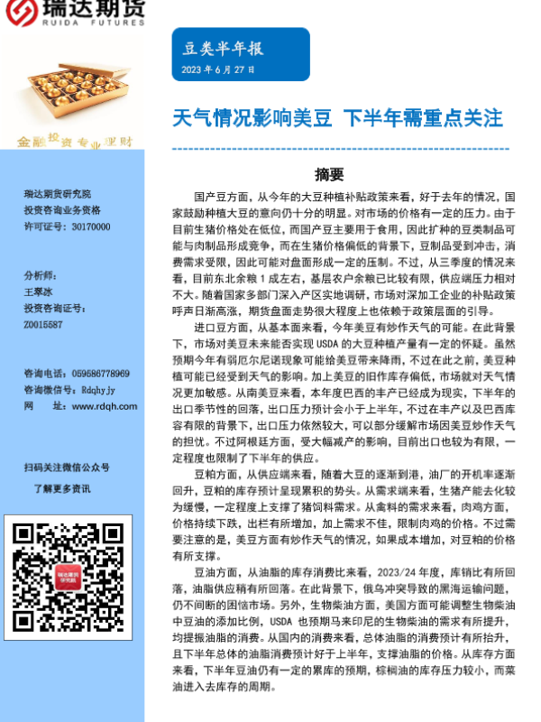 【瑞达期货】【20230627】豆类半年报:天气情况影响美豆,下半年需重点关注-28页 行业研究