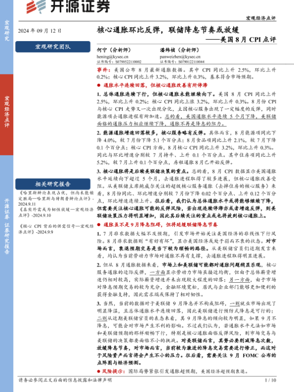【开源证券】【20240912】美国8月CPI点评:核心通胀环比反弹,联储降息节奏或放缓-10页 行业研究