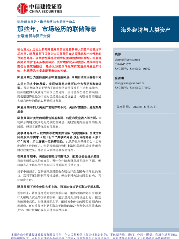 【中信建投证券】【20240829】海外经济与大类资产-宏观差异与资产走势:那些年,市场经历的联储降息-15页 行业研究
