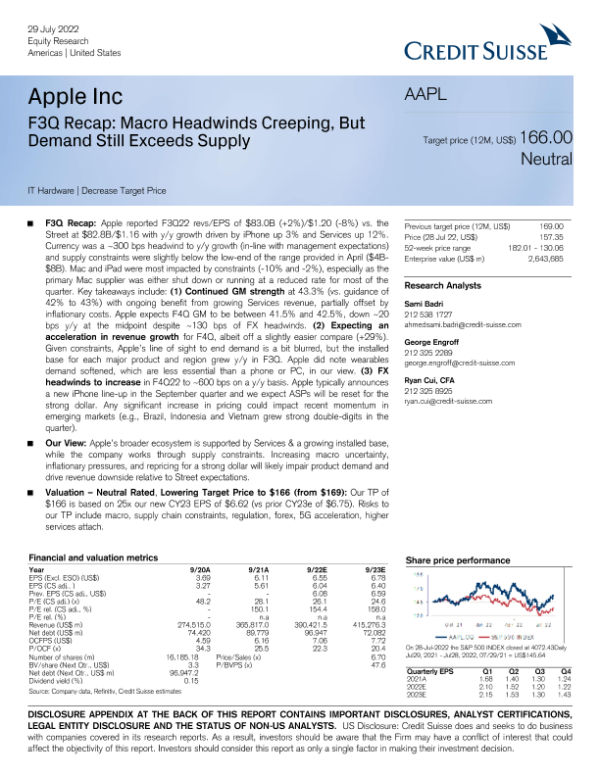 【Credit Suisse】【20220729】Apple Inc-F3Q Recap-7页 行业研究