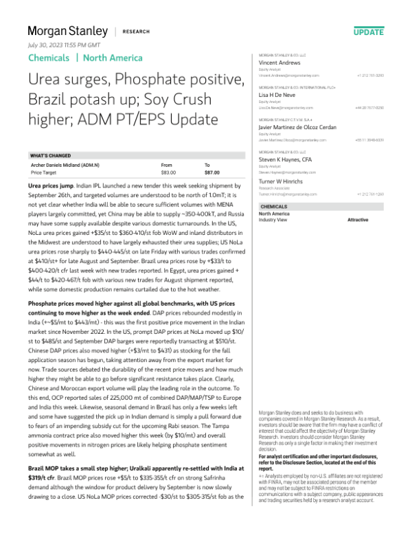 【Morgan Stanley】【20230728】Chemicals Urea surges, Phosphate positive, Brazil potash up...-103155317-47页 行业研究