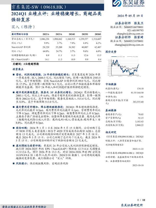 【东吴证券】【20240519】京东集团-SW(09618.HK)2024Q1业绩点评:业绩稳健增长,商超品类强劲复苏-10页 行业研究