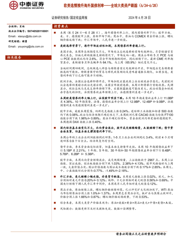 【中泰证券】【20240628】全球大类资产跟踪(6/24-6/28):欧美选情推升海外国债利率-15页 行业研究