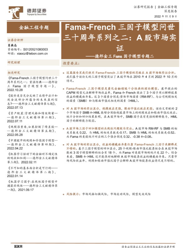 【德邦证券】【20221109】金工Fama因子模型专题二:Fama_French三因子模型问世三十周年系列之二,A股市场实证-15页 行业研究