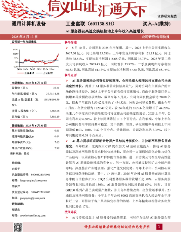 【山西证券】【20250813】AI服务器及高速交换机拉动上半年收入高速增长-5页 公司研究
