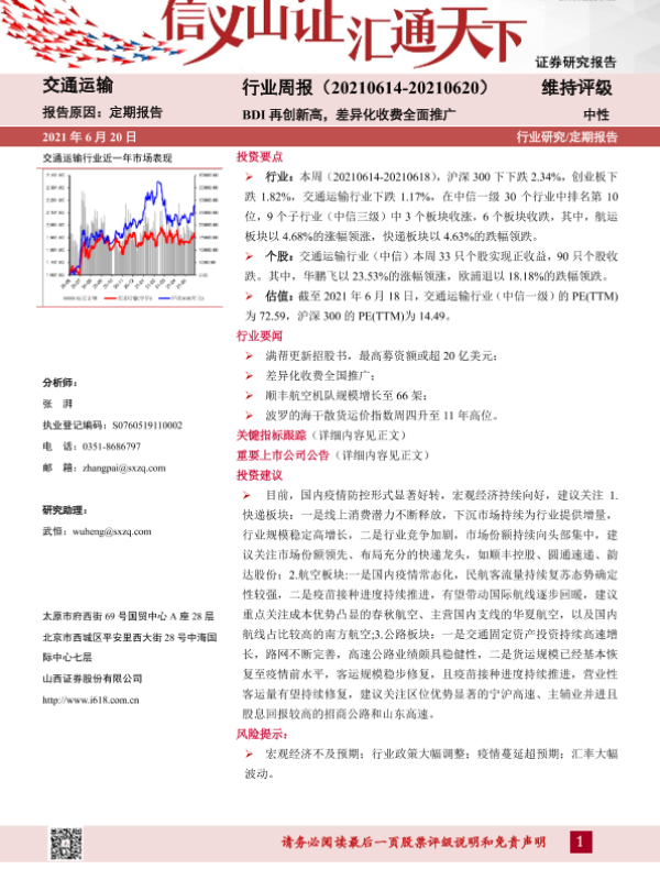 【山西证券】【20210620】交通运输行业周报:BDI再创新高,差异化收费全面推广-14页 行业研究