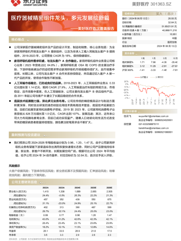 【东方证券】【20240613】美好医疗(301363)首次覆盖报告:医疗器械精密组件龙头,多元发展绘新篇-28页 行业研究