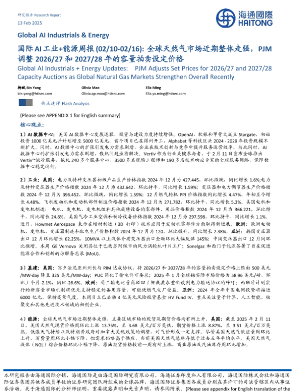 【海通国际】【20250216】国际AI工业+能源周报 全球天然气市场近期整体走强,PJM调整2026-27和2027-28年的容量拍卖设定价格-44页 行业研究