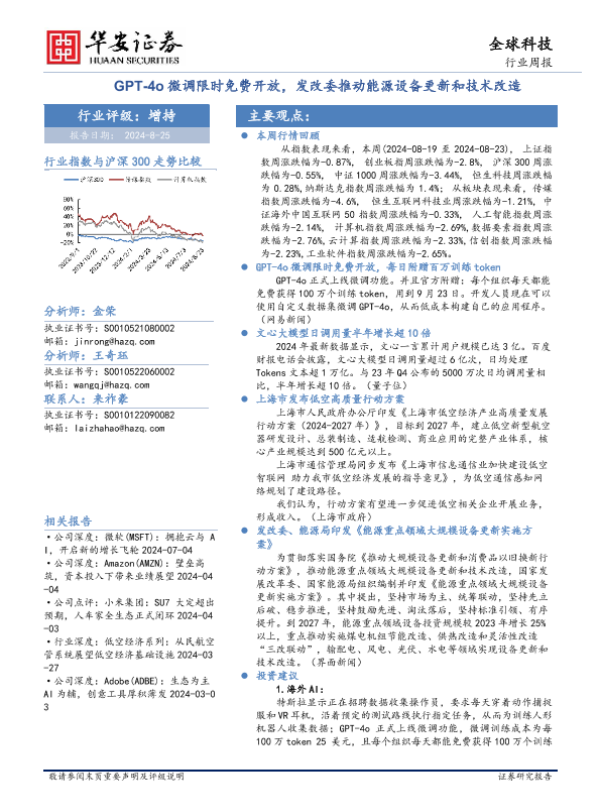 【华安证券】【20240825】全球科技行业周报:GPT-4o微调限时免费开放,发改委推动能源设备更新和技术改造-23页 行业研究