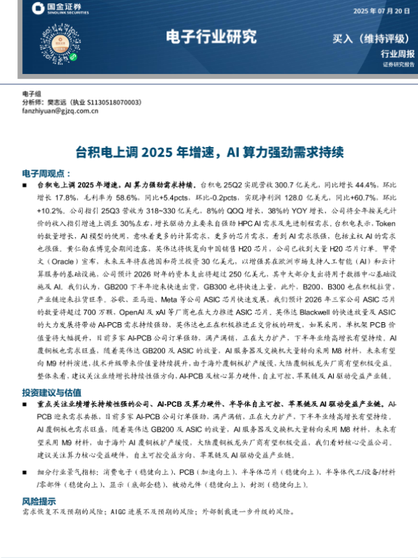【国金证券】【20250720】电子行业研究:台积电上调2025年增速,AI算力强劲需求持续-10页 行业研究