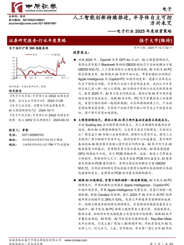 【中原证券】【20241202】电子行业2025年度投资策略:人工智能创新持续推进,半导体自主可控方兴未艾-63页 行业研究