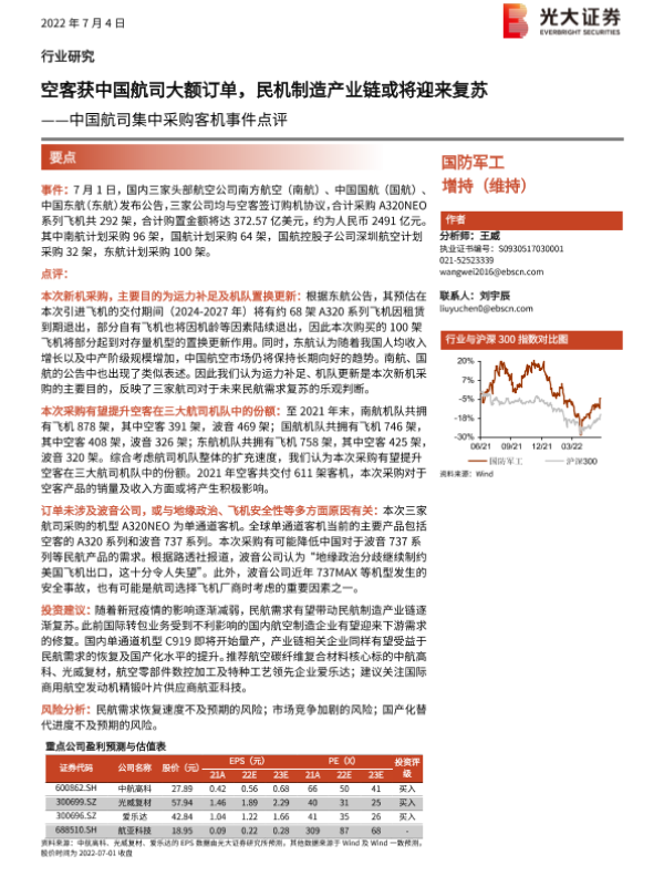 【光大证券】【20220704】国防军工中国航司集中采购客机事件点评:空客获中国航司大额订单,民机制造产业链或将迎来复苏-3页 行业研究