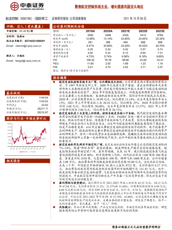 【中泰证券】【20211008】聚焦航发控制系统主业,增长提速巩固龙头地位-45页 行业研究
