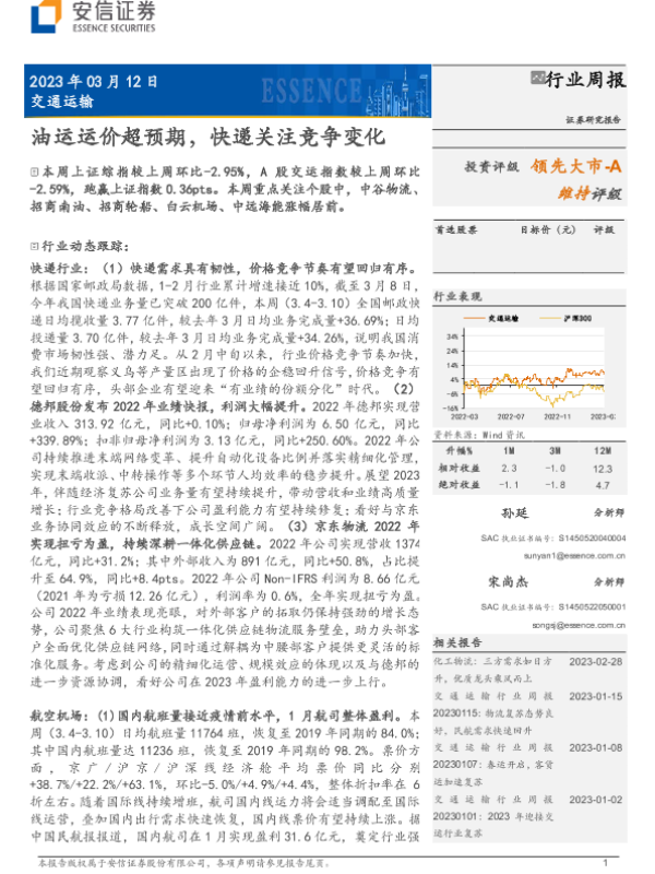 【安信证券】【20230312】交通运输行业周报:油运运价超预期,快递关注竞争变化-25页 行业研究
