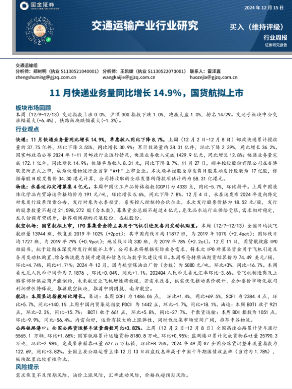 【国金证券】【20241215】交通运输产业行业研究:11月快递业务量同比增长14.9%-16页 行业研究