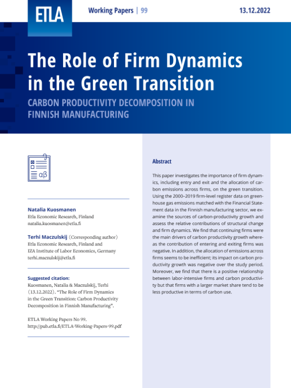 【芬兰经济研究所】【20221213】企业动力在绿色转型中的作用:芬兰制造业的碳生产率分解-36页 行业研究
