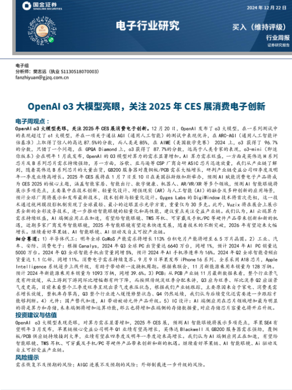 【国金证券】【20241222】20241222-国金证券-电子行业研究:OpenAI o3大模型亮眼,关注2025年CES展消费电子创新-10页 行业研究