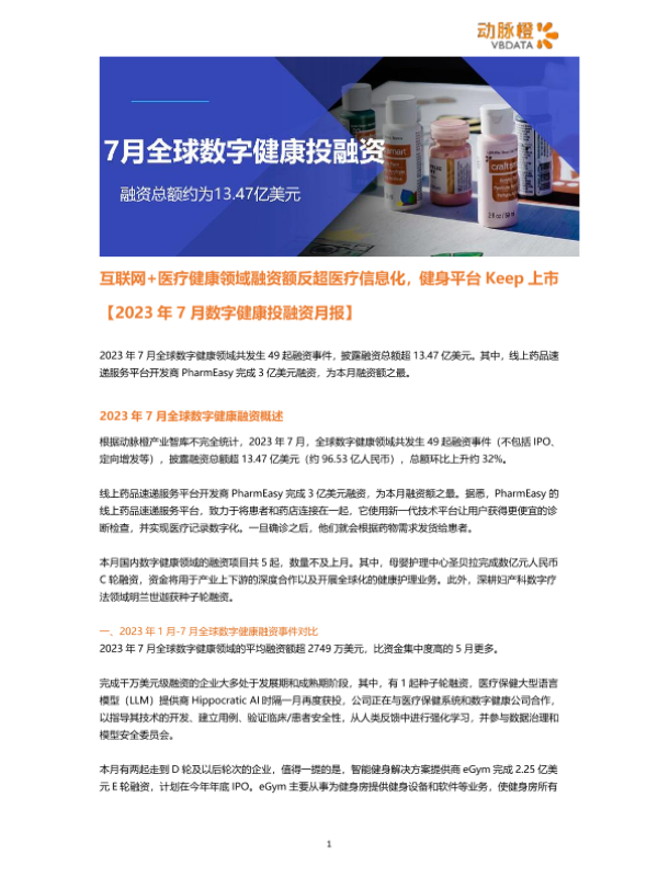 【动脉橙产业智库】【20230701】2023年7月数字健康投融资月报-6页 行业研究