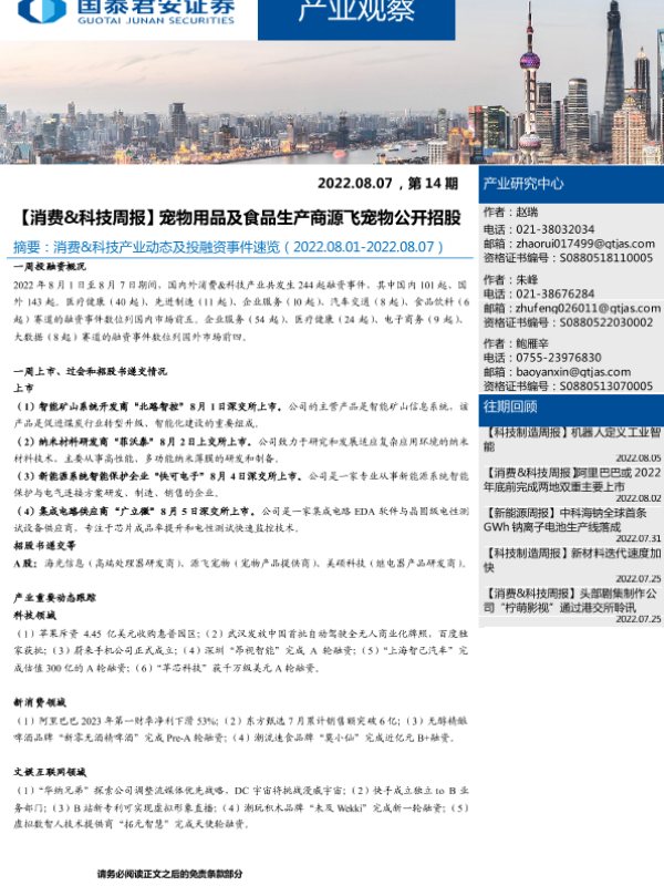 【国泰君安证券】【20220807】20220807-国泰君安-产业观察:【消费&科技周报】宠物用品及食品生产商源飞宠物公开招股-10页 招股书