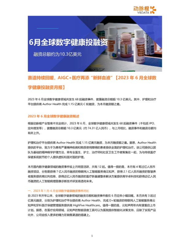 【动脉橙产业智库】【202306】赛道持续回暖,AIGC+医疗再添“新鲜血液”【2023年6月全球数字健康投融资月报】-6页 行业研究