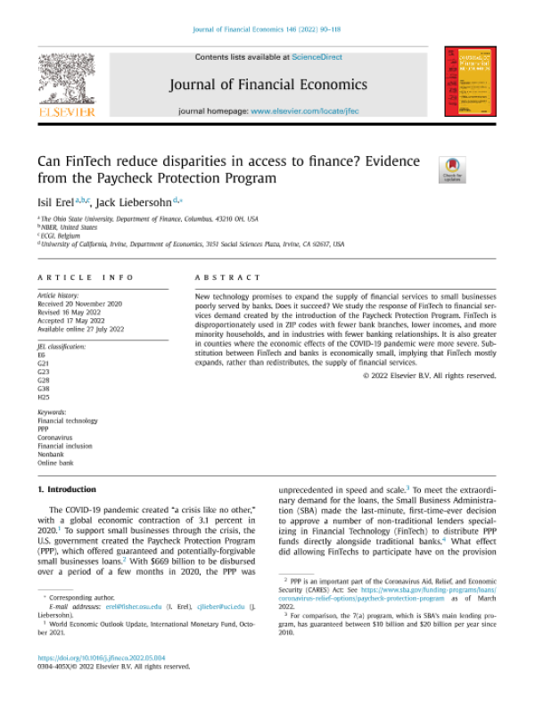 【Journal of Financial Economics】【20220517】Can FinTech reduce disparities in access to finance? Evidence from the Paycheck Protection Program-29页 行业研究