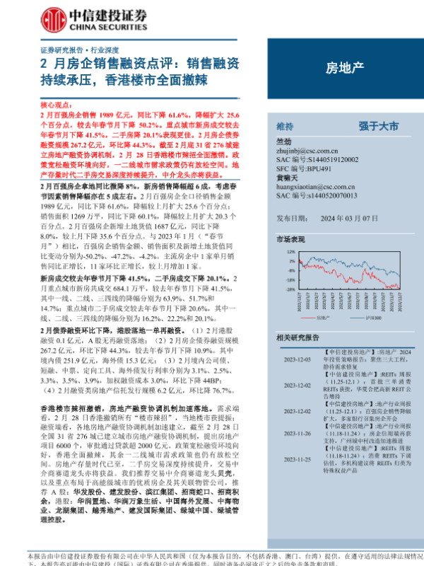 【中信建投证券】【20240307】房地产行业2月房企销售融资点评:销售融资持续承压,香港楼市全面撤辣-24页 行业研究