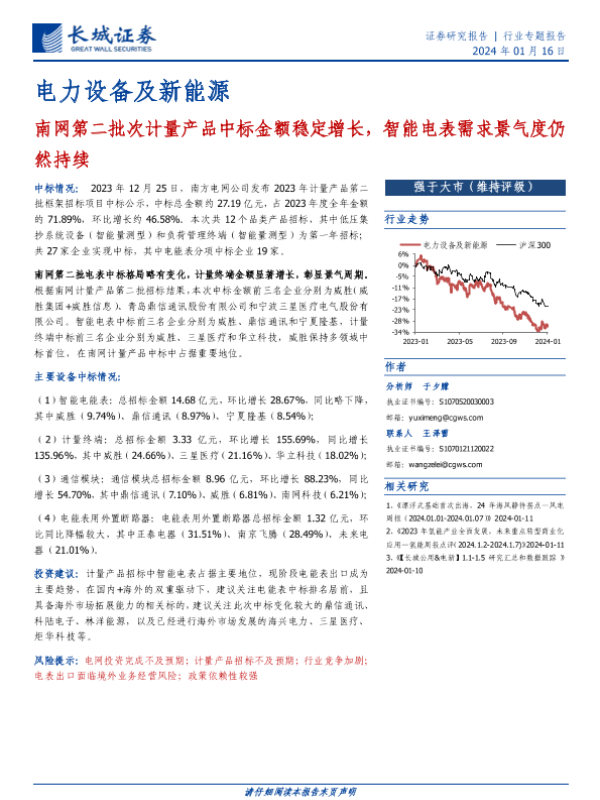 【长城证券】【20240116】电力设备及新能源行业专题报告:南网第二批次计量产品中标金额稳定增长,智能电表需求景气度仍然持续-17页 行业研究
